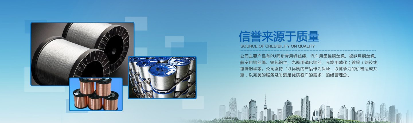 公司主要產(chǎn)品有PU同步帶用鋼絲繩、汽車用柔性鋼絲繩、操縱用鋼絲繩、航空用鋼絲繩、銅包鋼絲、光纜用磷化鋼絲、光纜用磷化(鍍鋅)鋼絞線、鍍鋅鋼絲等。經(jīng)過(guò)多年的研究、摸索、開發(fā),公司已形成了完整的技術(shù)、工藝軟件,產(chǎn)品實(shí)物質(zhì)量均達(dá)到國(guó)際先進(jìn)水平。